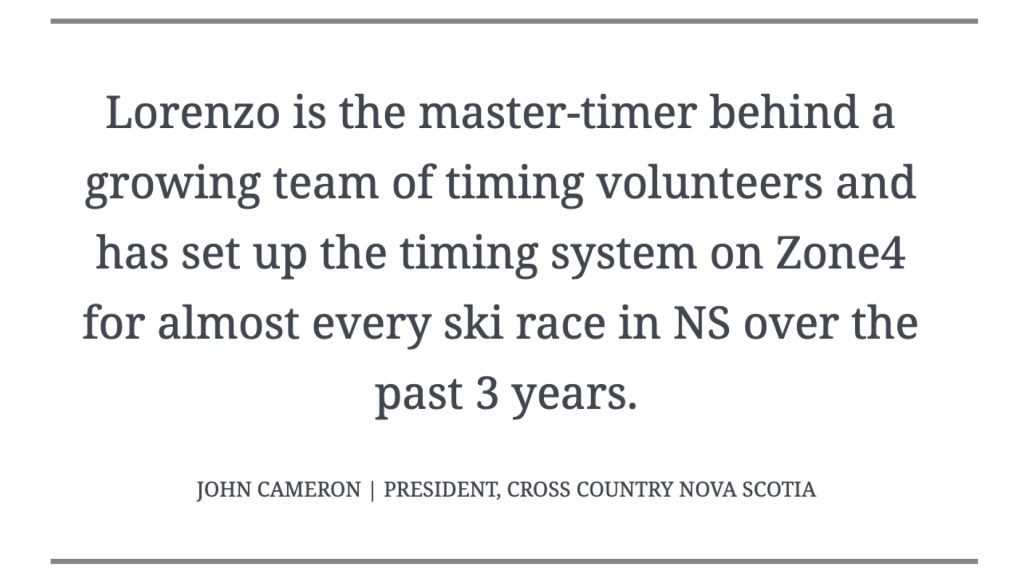 Lorenzo is the master-timer behind a growing team of timing volunteers and has set up the timing system on Zone4 for almost every ski race in NS over the past 3 years.