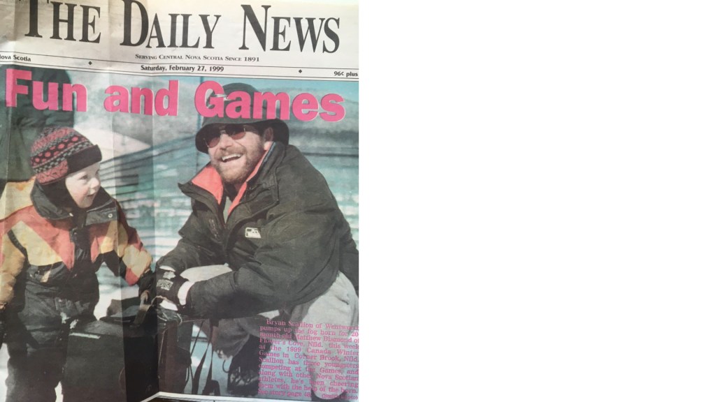 Photo #1 – Article (Chronicle Herald, 1971). Photo #2 – 1971 Canada Winter Games. Bryan Scallion skiing, far left.