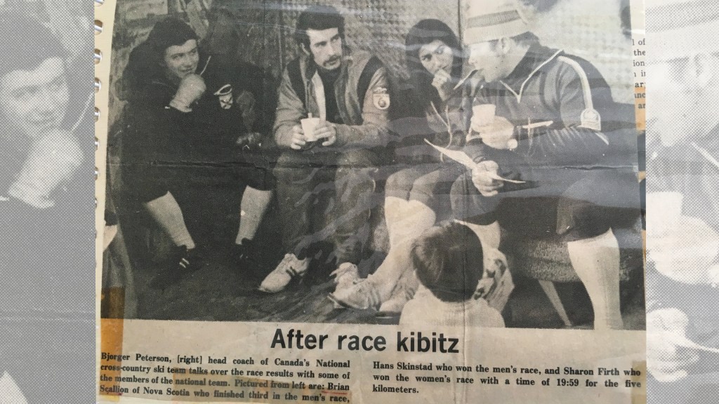 Bjorger Peterson, (right) head coach of Canada’s National cross-country ski team talks over the race results with some of the members of the national team. Pictured from left are: Brian Scallion of Nova Scotia who finished third in the men’s race, Hans Skinstad who won the men’s race, and Sharon Firth who won the women’s race with a time of 19:59 for the five kilometers.