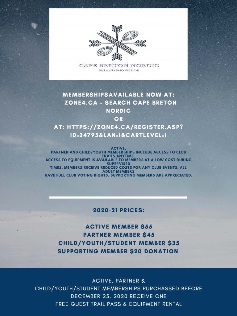 Cape Breton Nordic’s membership details are included in their flyer below. There is something for everyone! All ages and abilities are encouraged to join. Please register by visiting, Zone 4. Questions? Please contact cbxcski@gmail.com.