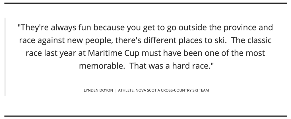 “They’re always fun because you get to go outside the province and race against new people, there’s different places to ski. The classic race last year at Maritime Cup must have been one of the most memorable. That was a hard race.”