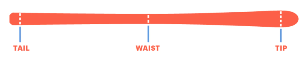 Ski width is typically measured at three locations—the tip (the widest point near the front of the ski), the waist (the narrowest point near the middle of the ski) and the tail (near the back of the ski). The resulting hourglass shape is called the sidecut.