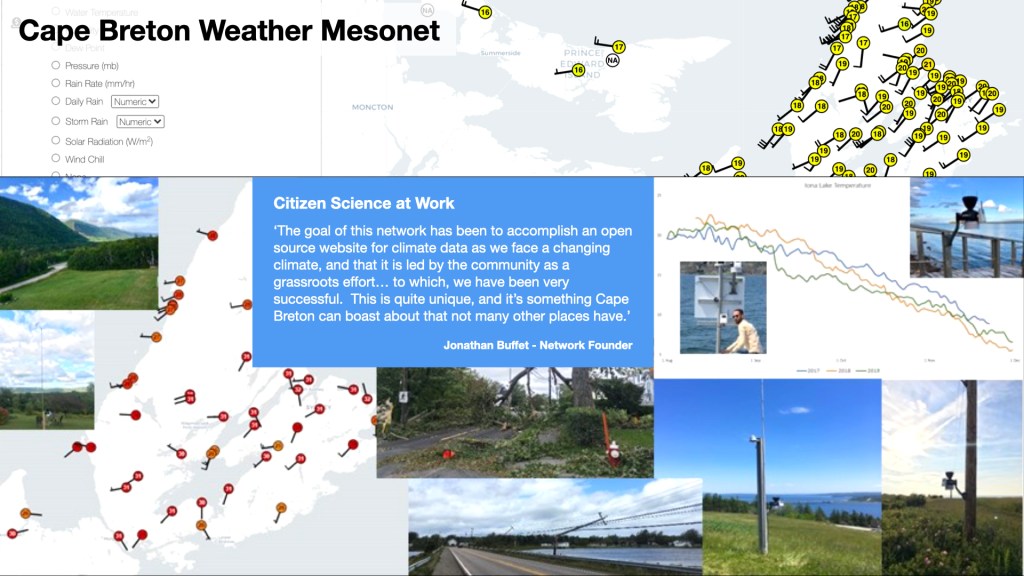 The Cape Breton Mesonet provides live and archived weather data for Cape Breton Island and parts of mainland Nova Scotia. It is a citizen science initiative founded by Jonathan Buffet . There are over 50 weather stations in Cape Breton Island and parts of mainland Nova Scotia. An incredible resource for tapping into weather data for targeted regions.