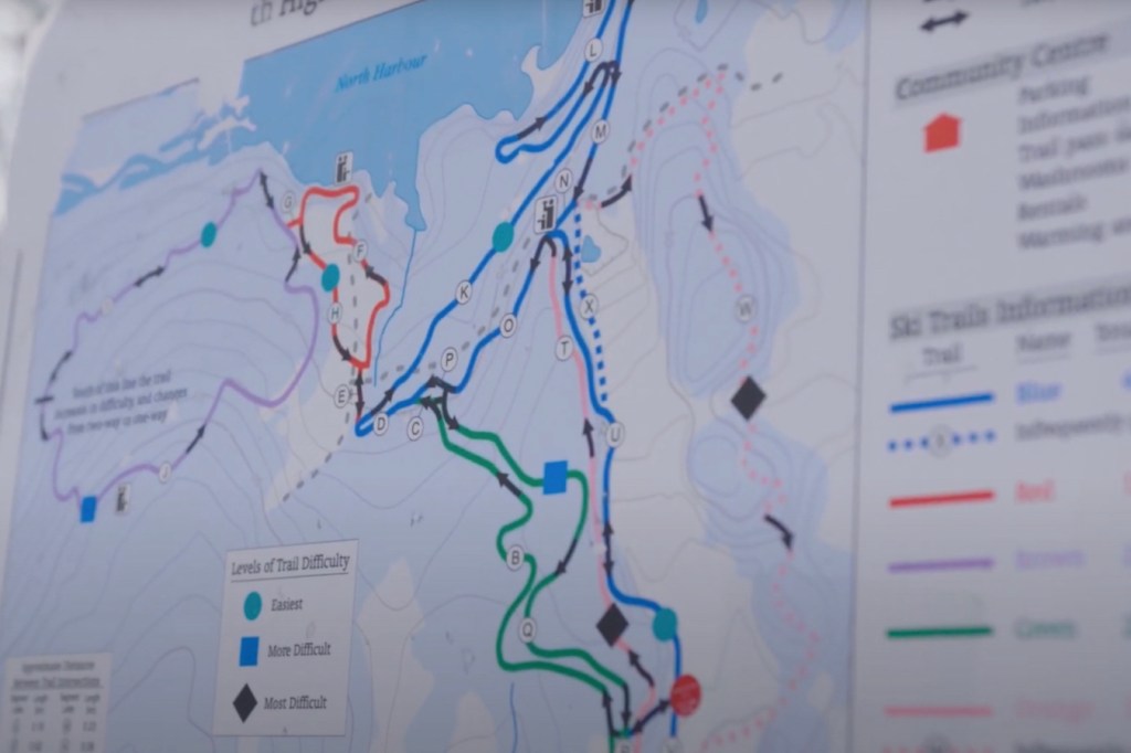 The trail system has terrain for every skier ability including: gentle and rolling trails (green circle), intermediate terrain (blue square), and challenging hills (black diamond). The width of the trails is 16 feet, with grooming for skate and classic technique. Snowshoeing is also encouraged. Every trail is well-marked. Trail maps can be viewed at many locations along the way – ensuring skiers are well-informed of their location. Trail map photographed above. Photo credit – East Coast Kids.