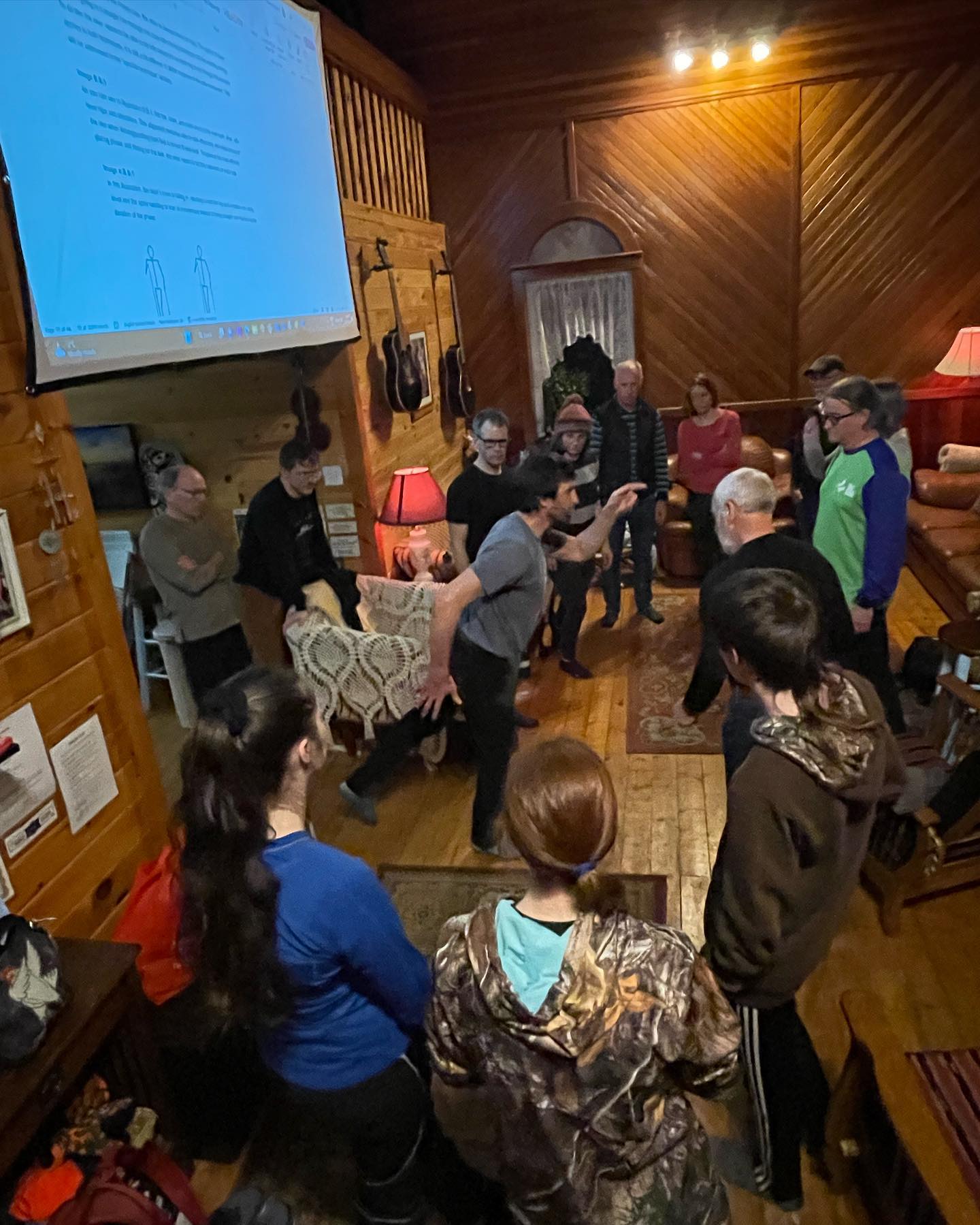 Stephen Novosad (red hat) instructs participants on-snow at North Highlands Nordic in Cape North, Cape Breton Island, Nova Scotia. The course participants stayed at the Highlands Hostel (photographed bottom right), which is one kilometer from the nordic centre.