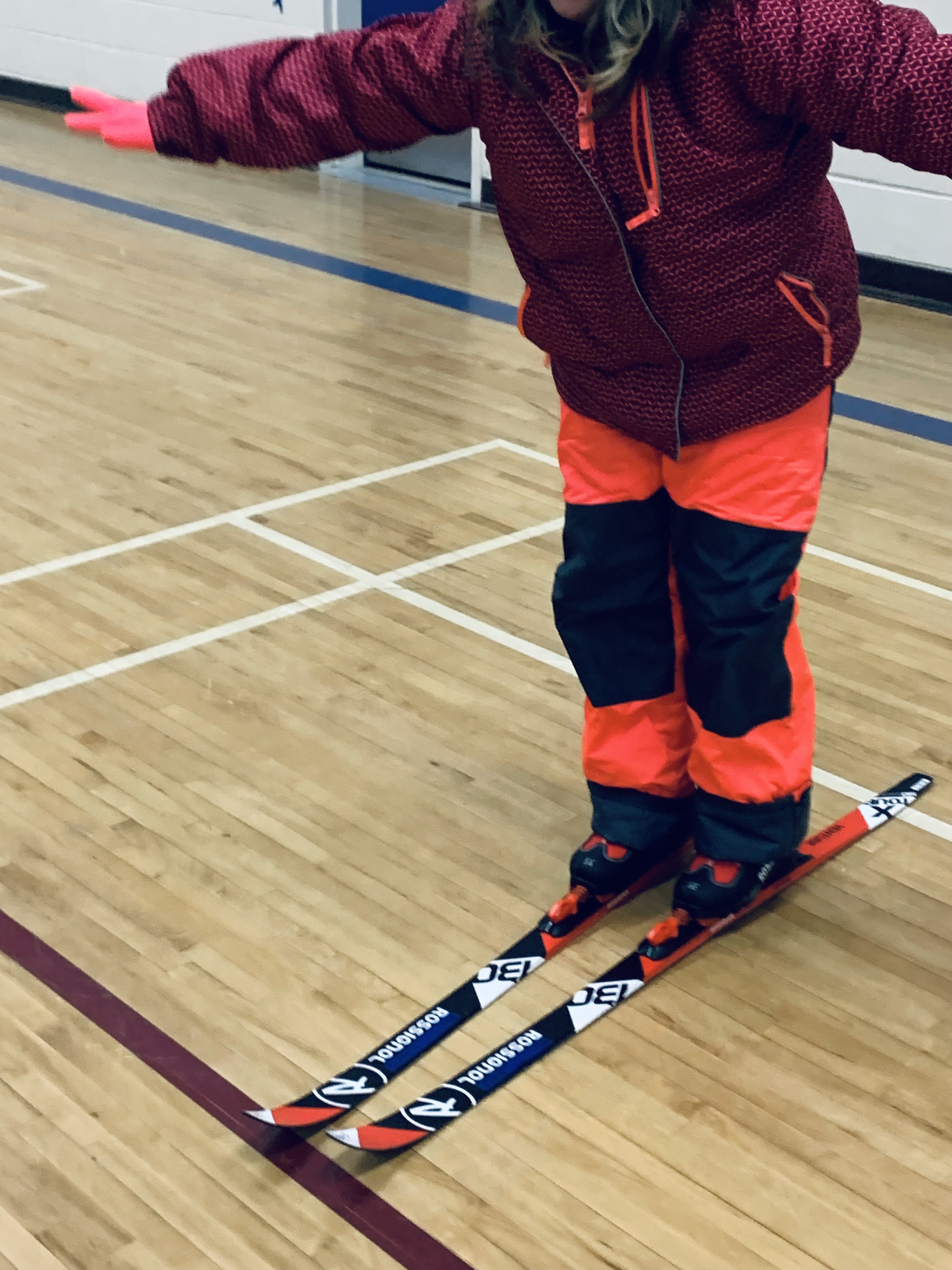 Stacey as photographed below enjoying cross-country skiing on the trails, teaching her students, and also volunteering with the new Canadians on skis project.
