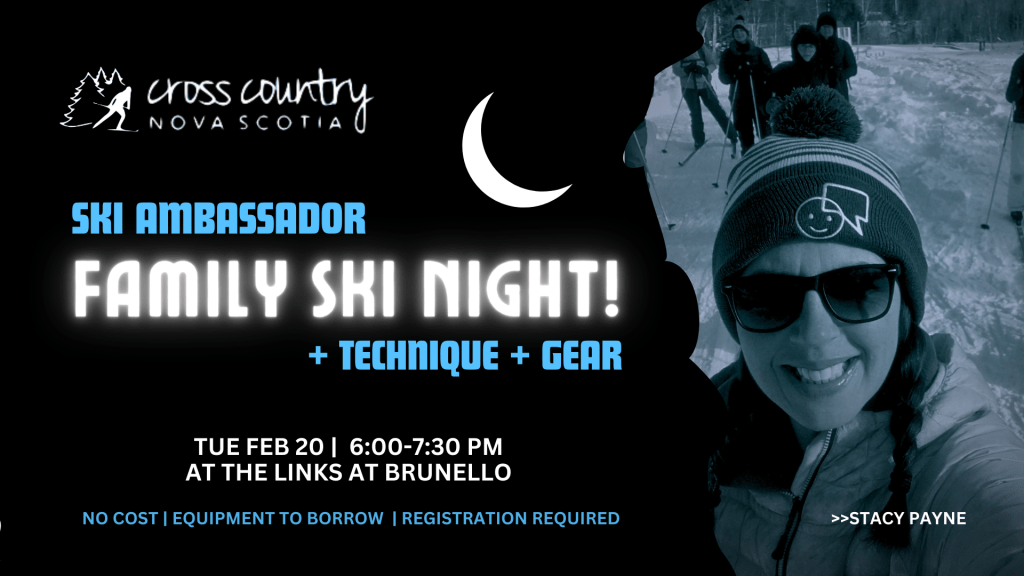 Bring the whole family to try cross-country skiing at the Links at Brunello, on Tuesday, February 20, from 6 pm – 7:30 pm. The lesson area is lit for night skiing. Cross Country Nova Scotia’s ski ambassador, Stacy Payne, will provide all of the basic instruction you require to learn and enjoy cross-country skiing – classic technique.