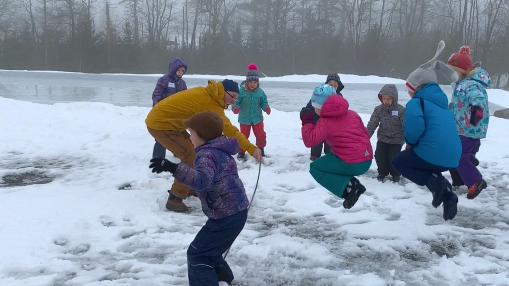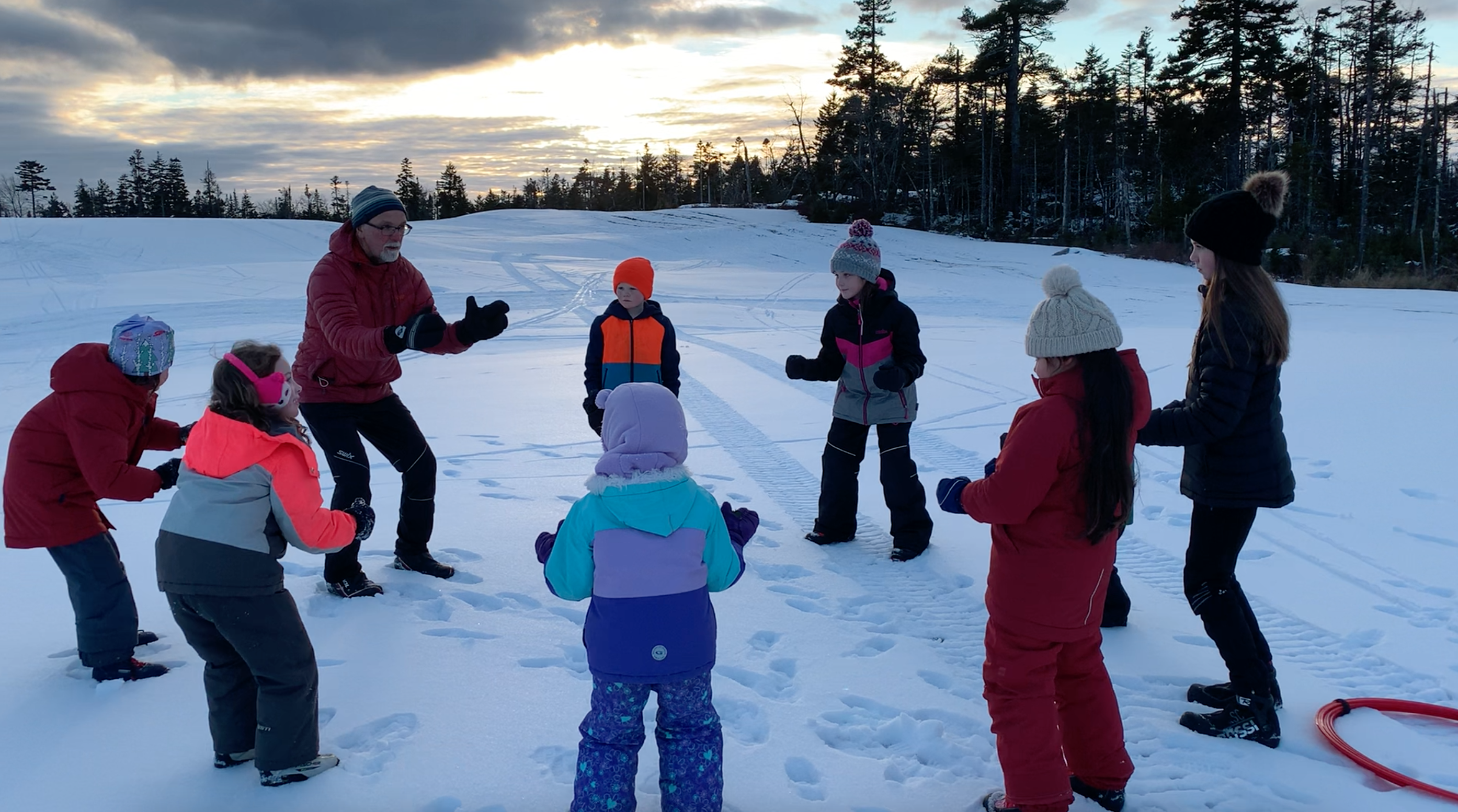 Hubley instructing youth skiers for Scotia XC Ski Club, over the years. Noting the always popular rubber chicken tag game!