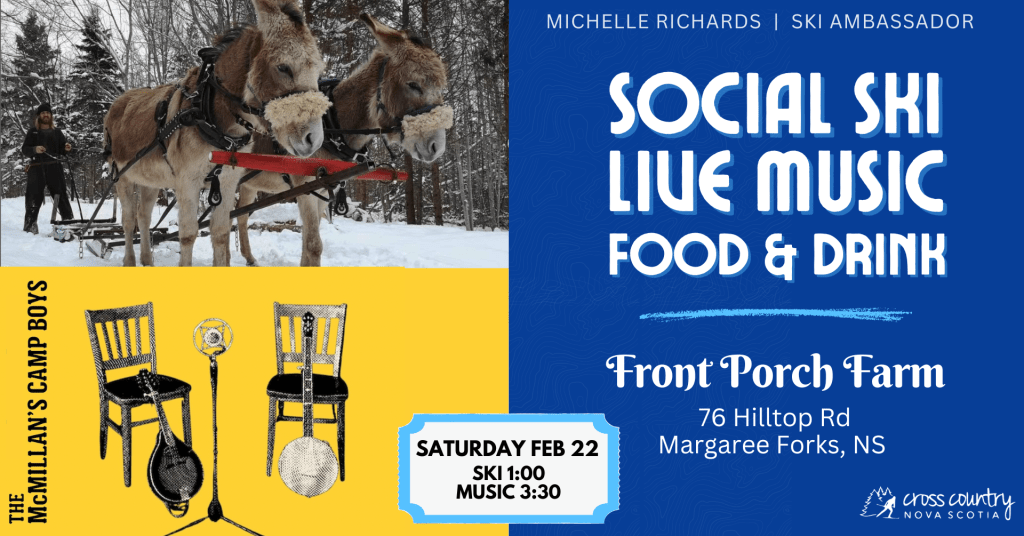 Ski in a fun group on an organic farm, warm up by the woodstove, enjoy a hot meal and hot drinks – and stay for live music by the McMillan’s Camp Boys. Led by Michelle Richards, ski ambassador. This is going to be a time!