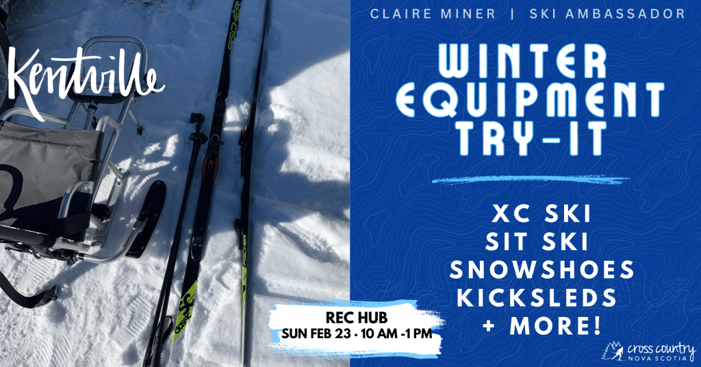 Did you know we have a sit ski available to try at events? Claire Miner, ski ambassador, is trained to coach para nordic and able bodied participants. A sit ski is in the photo below. It is a specially designed ski with a bucket seat that allows people to ski while sitting down. The Town of Kentville also has a sit ski available to borrow.