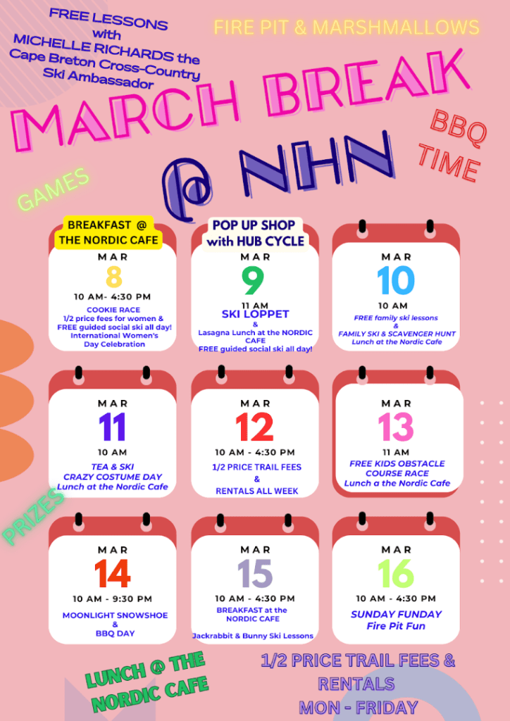 View the event line-up in the graphic below – you can join free lessons and social skis with ski ambassador, Michelle Richards, register here; ski loppet; cookie race for the youngsters; family ski and scavenger hunt; meals; and more listed as below! There is even 50% off trail fees and rental equipment rates for Mon-Fri.